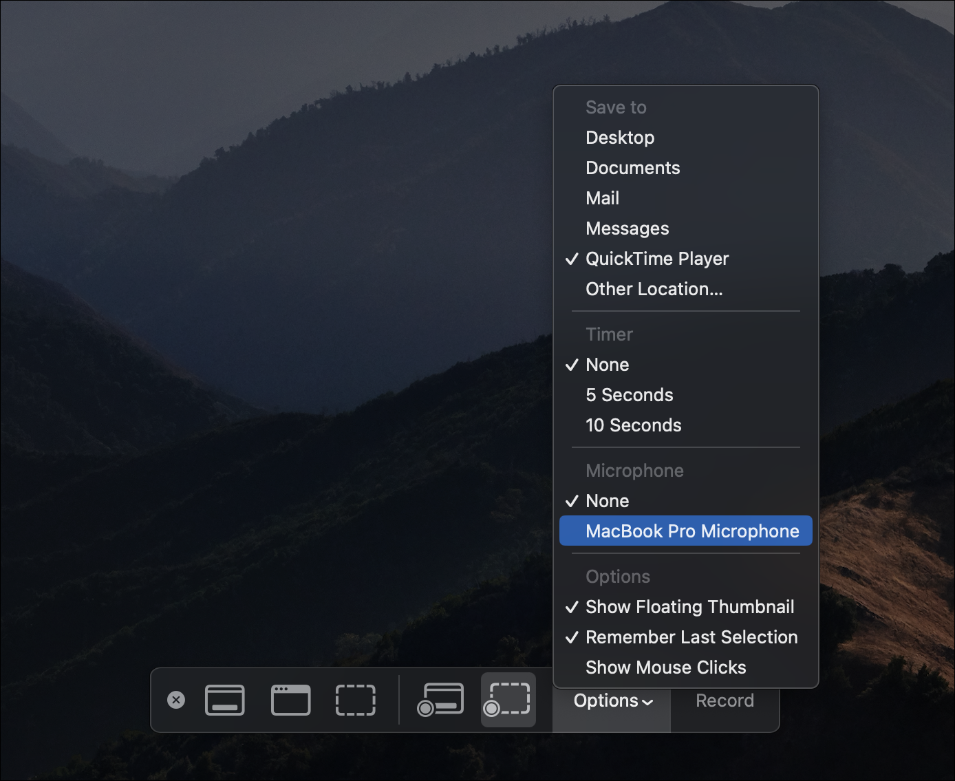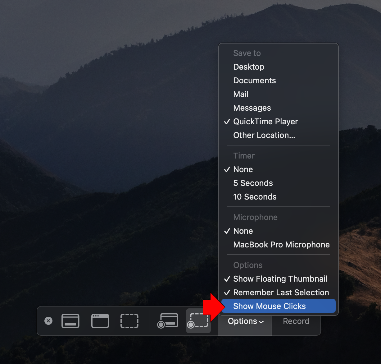- Strike the arrow next to the record button and find the “Show Mouse Clicks in Recording” prompt if you want the app to emphasize your mouse clicks.
