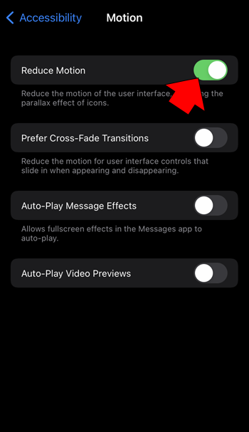 - Turn off “Reduce Motion” by tapping the toggle switch.