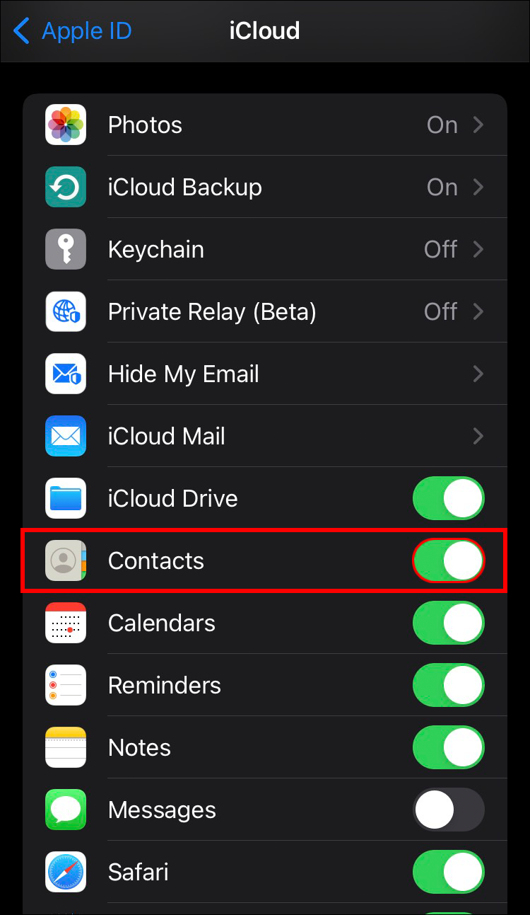 - Find “Contacts” on the list of apps using iCloud and make sure the toggle is on.