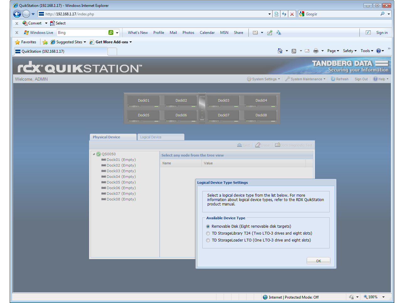 They’re SATA drives, with six cabled to the motherboard and two plugged into a PCI Express SATA interface card. The QuikStation allows the drives to be presented as eight disks, each with their own target IQN. It can also emulate a single Tandberg StorageLibrary T24 with two LTO-3 tape drives and eight slots; or a Tandberg StorageLoader with one LTO-3 drive.