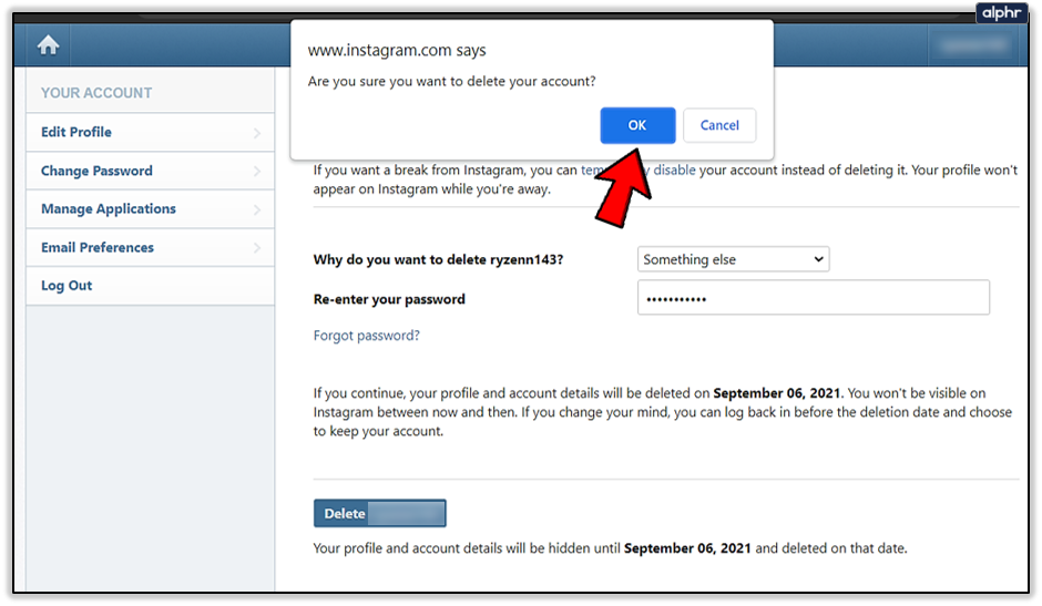 - To delete Instagram, click “Delete” button at the bottom.