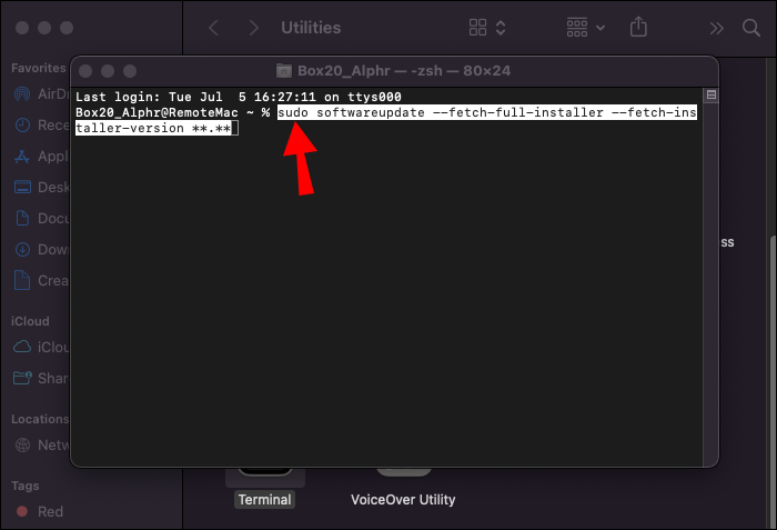 sudo softwareupdate --fetch-full-installer” (without quotation marks).
