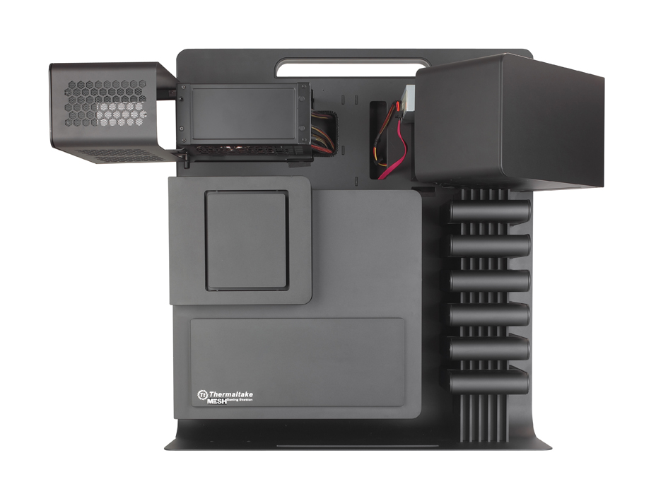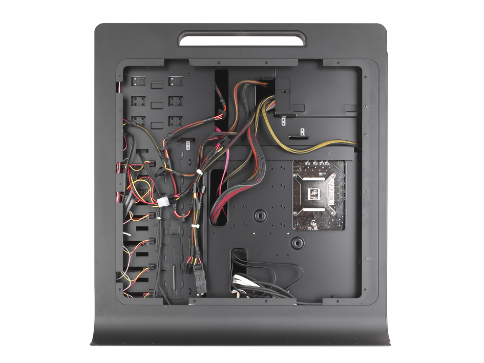 Thermaltake has included several neat design touches to aid system builders. The removable motherboard tray – revealed by unlocking the rear of the chassis and sliding the door panel off – includes a handy hole for easy access to a heatsink or water-cooling block’s backplate. The optical drive cover lifts off its hinges easily, which allows for drives to be slid into place unimpaired, and the PSU bracket is also detachable.
