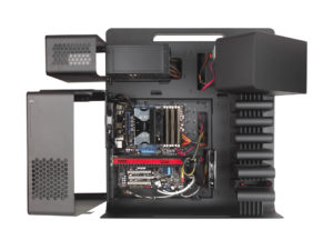 This means the motherboard – which can be an ATX or microATX model – CPU and GPU are contained in the main enclosure and the PSU sits separately above, while the optical drives are perched further forward in their own box. Each of the six hard disk bays (all of which include mounting holes for 3.5in and 2.5in disks) is contained within its own curved enclosure perpendicular to the main spine, with red lights to indicate occupation.