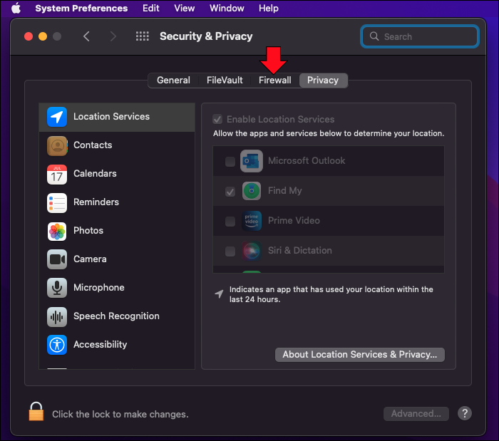 - Pick “Security” and click the “Firewall” tab.