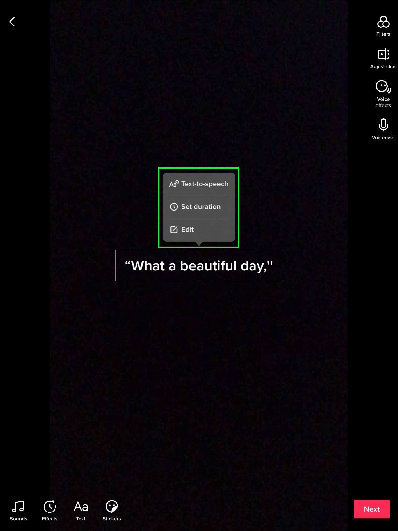 - A pop-up menu with three options will appear – “Text-to-Speech,” “Set Duration,” and “Edit.”