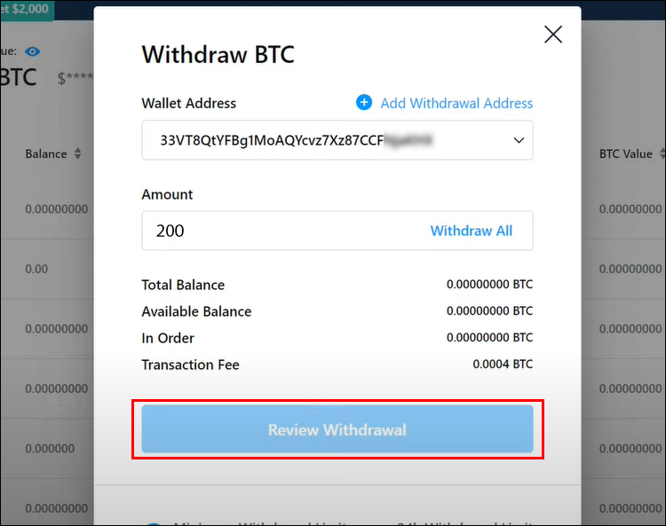 - Hit “Review Withdrawal” and go over the transaction details. The amount you receive on Coinbase will be minus the transaction fee.
