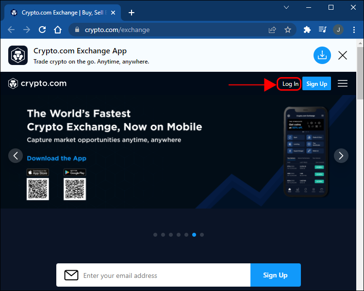 - Go to the Crypto.com exchange and tap the “Log In” button.
