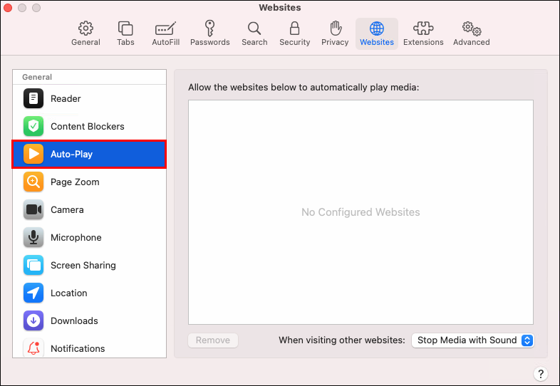 - Scroll to “Autoplay” and select “Never Play Autoplay Videos.”