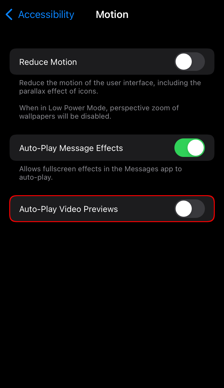 - You will see an option for “Auto-Play Video Previews” with a green bar next to it. Swipe the bar to the left to switch off autoplay.