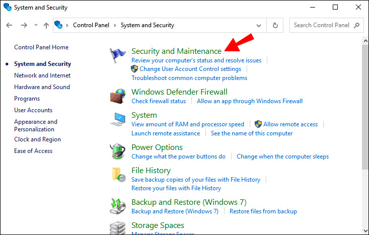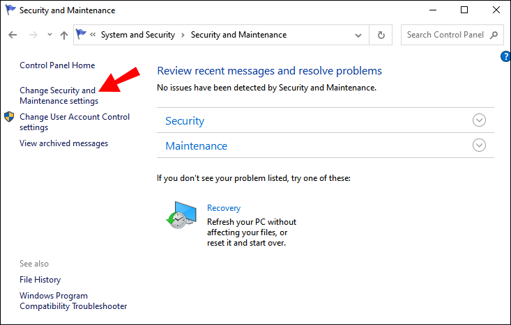 - Now, select “Change Security and Maintenance settings” on the left side of the window.