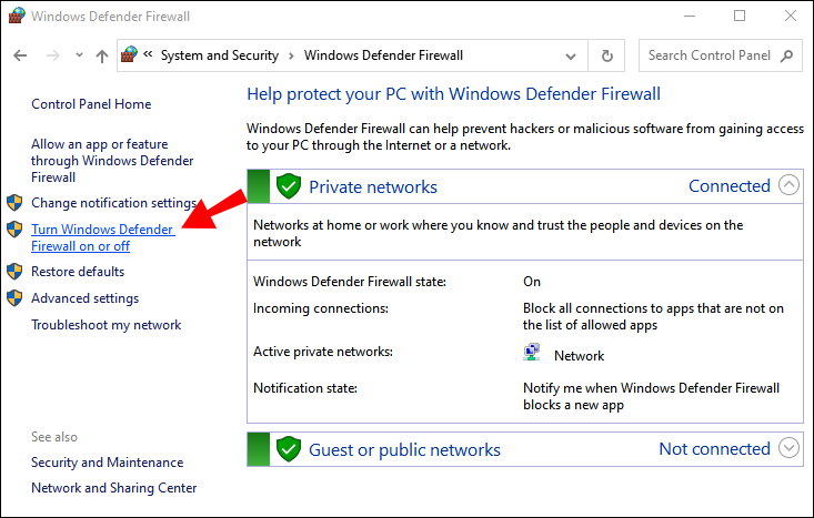 - On the left side of the window, select “Turn Windows Defender Firewall on or off.”