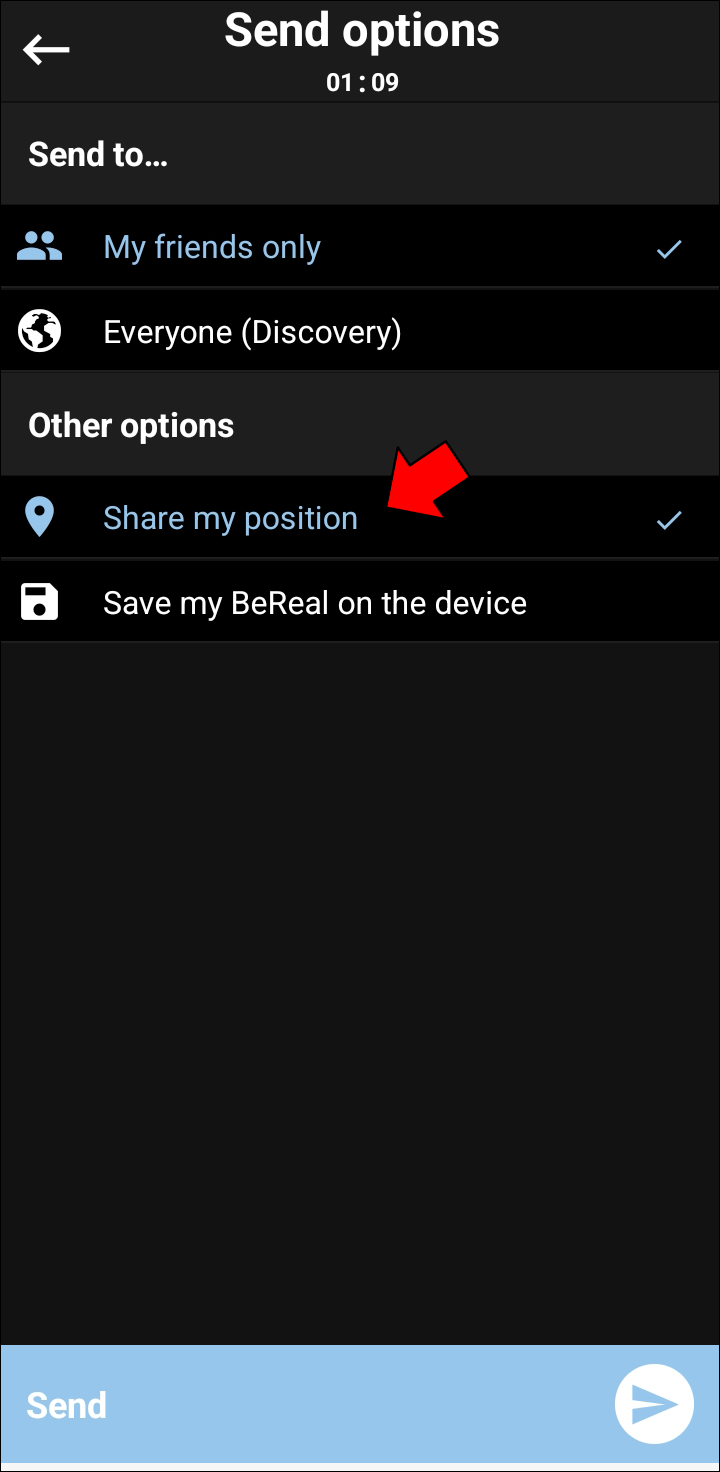 - Hit the “Send” button and your BeReal, containing your location, is now on your friends’ feeds.