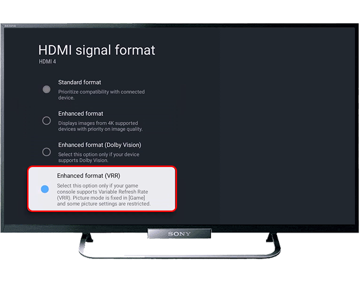 The chosen HDMI input will be put into game mode, so make sure to connect your gaming console to that specific HDMI port. Note that some Sony TV models will have the “Enhanced format (VRR)” option only on connectors “HDMI 3” and “HDMI 4,” so use those.