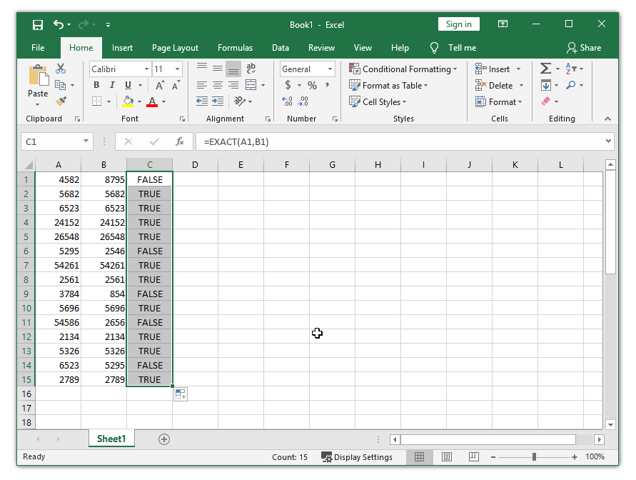 - After copying the formula down the column, you should notice that the “FALSE” value appears for non-duplicates in each row, and “TRUE” appears for identical ones.