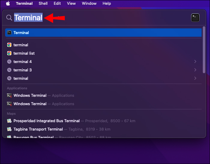 Terminal“ into the Spotlight search bar and press the “Enter” key.