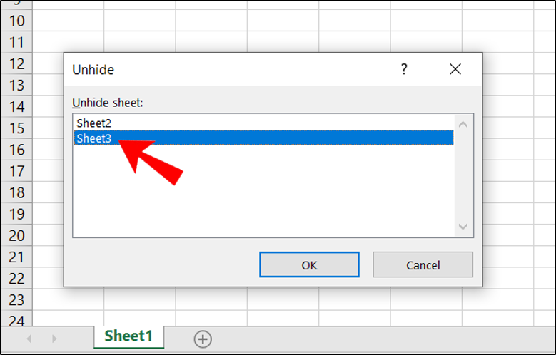 - When you need to unhide, select the name of the Workbook and then “OK.”