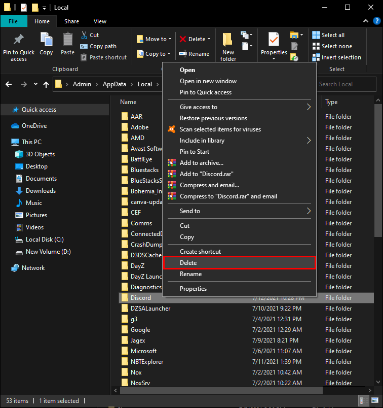 - Find “Local\Discord” and “Roaming\Discord” folders and delete them.