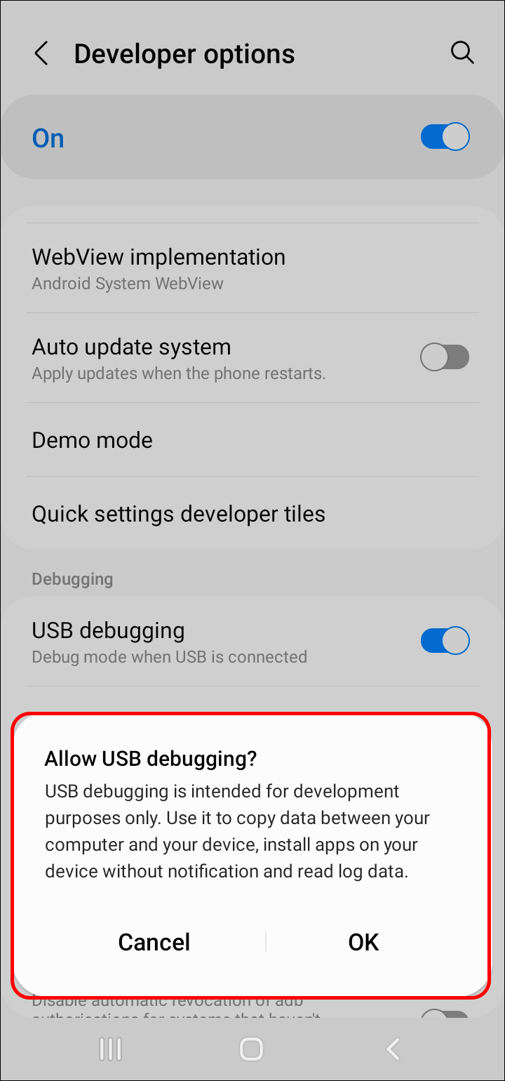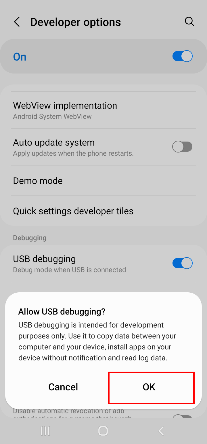 - Go to developer settings again and turn on the “USB debugging” option.