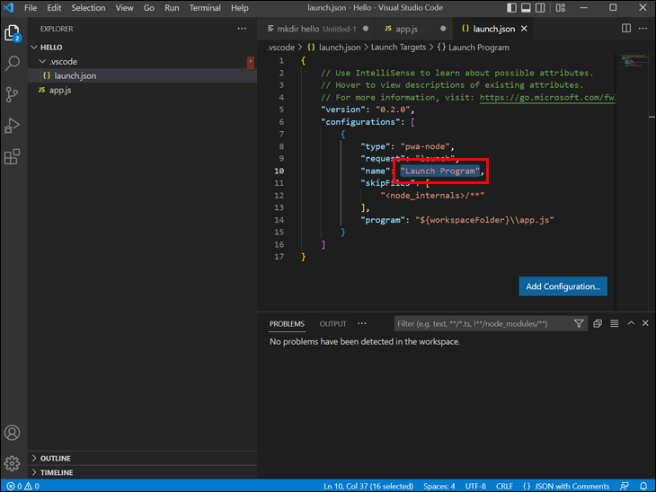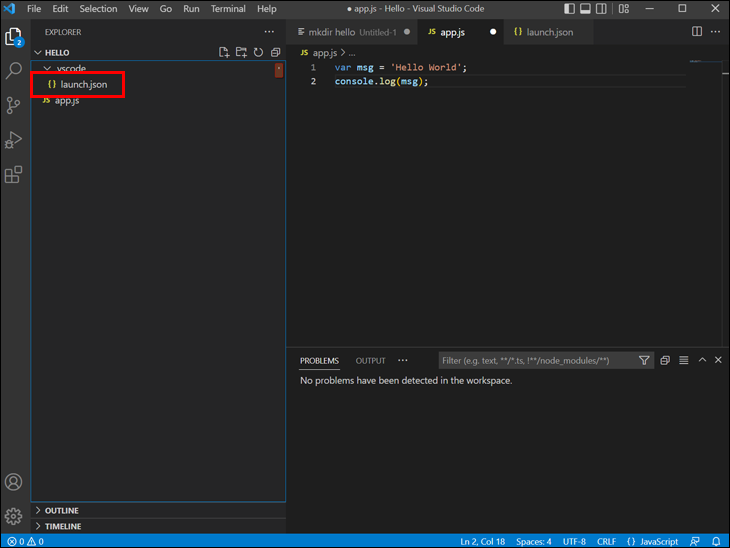 Node.js is the platform that VSCode’s debugger runs as default. You need it to track everything that is happening with your code. This makes it easier to identify the problem. Also, there are some features in VSCode debugger that only work with JavaScript. You will have to create a simple program, the famous “Hello, World” program. Once you complete this step, running the debugger will be smooth and fast.