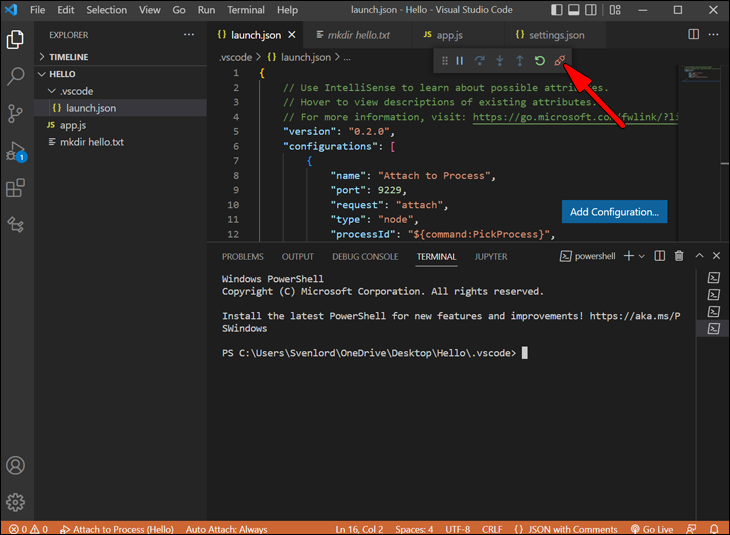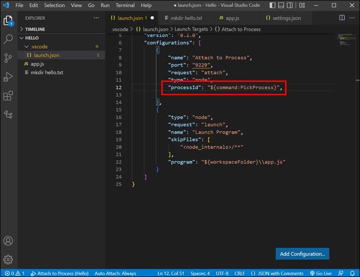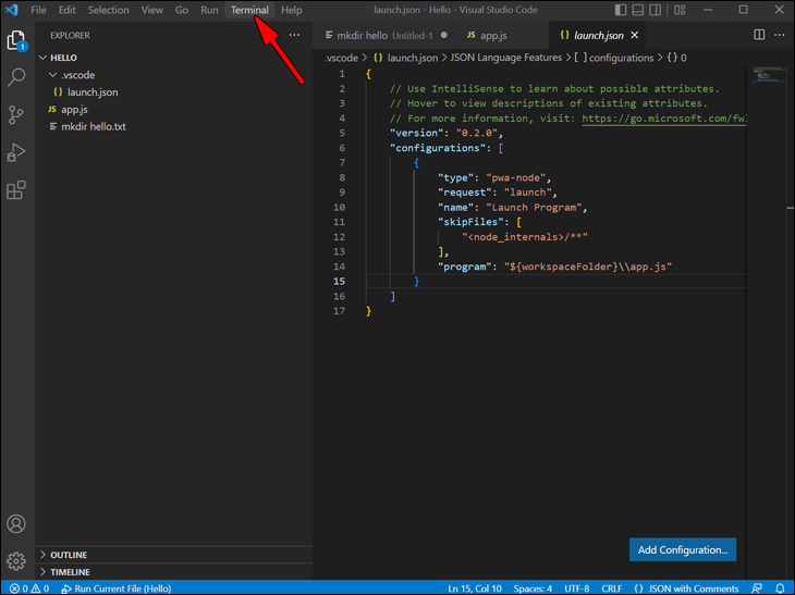 - Check under your folder “hello.” There should be a tab called “.vscode” and the launch.json should be in that tab.