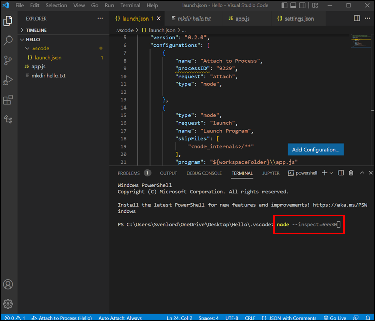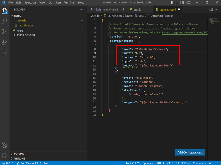 Note: these numbers are just examples. Use whichever port number that works for you. - After you’ve changed the port number, change it in the attach configuration you wrote.