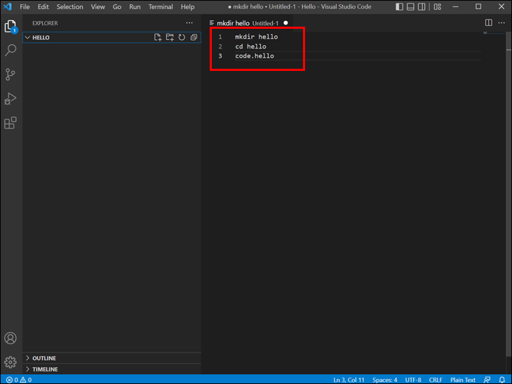 - Find the File Explorer toolbar. Your file should show up with the name “Hello.” Click the “New File” button on the right side of the file name.