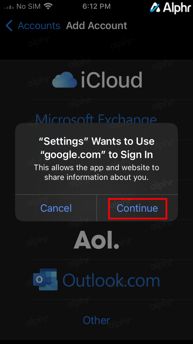 - In the permissions popup, select Continue to allow Settings to use google.com to sign in.