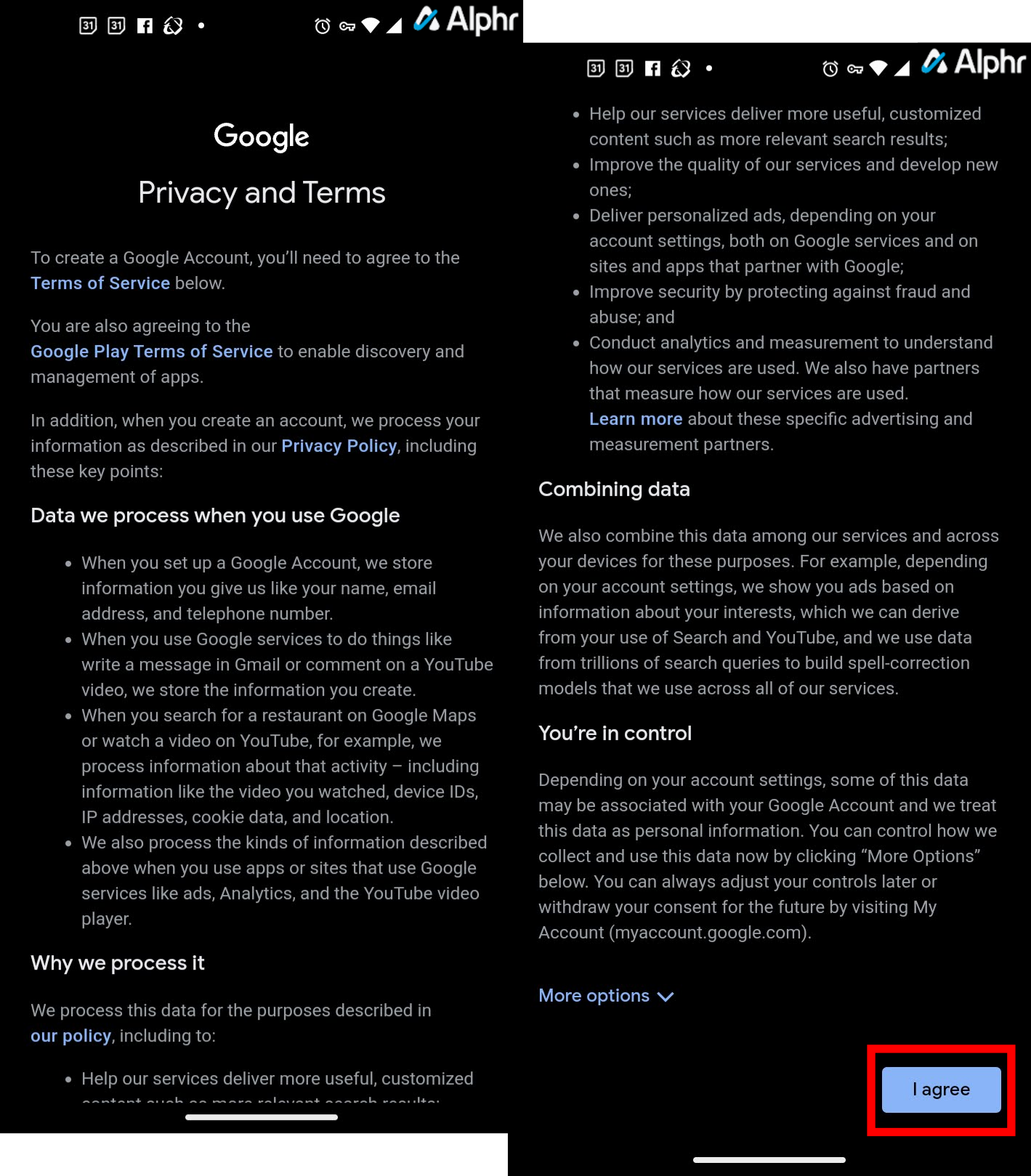 - Tap on I agree on the Privacy and Terms screen, or choose More options first.