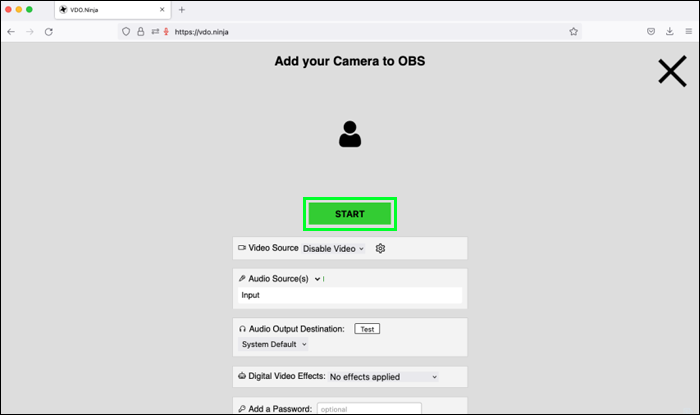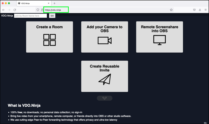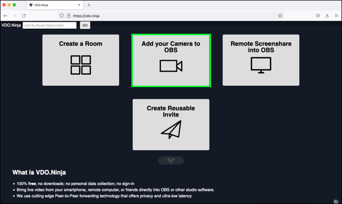 - Next, you’ll need to tell OBS that you’ll use your device as a webcam. To do that on your device, go to vdo.ninja.