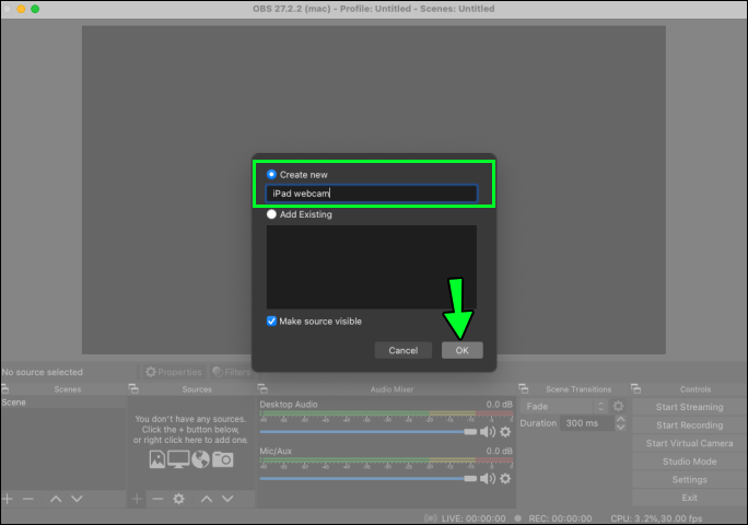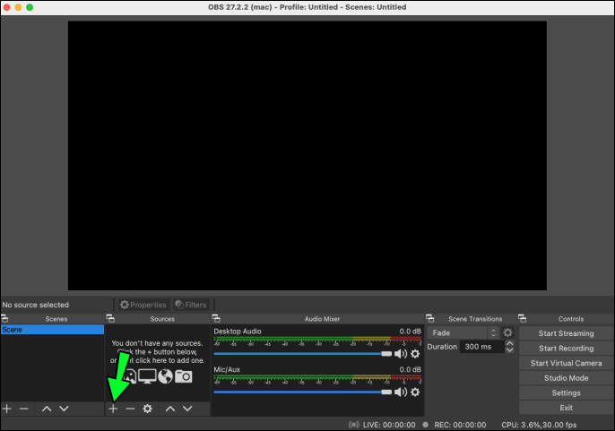 - Back in the OBS program on your Mac, select “Sources” towards the bottom of the screen, then click on the little “+” sign.