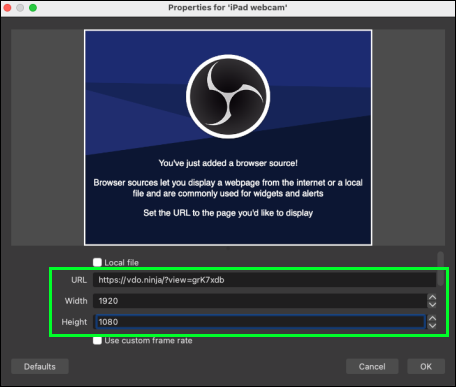 - Enter or paste the URL from step 6 into the “URL” text field on the next screen. In the “Width” text field, enter 1920 and 1080 as the “Height.”