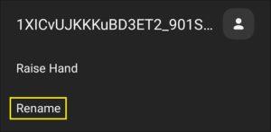 - Find your name on the list and tap on it. Zoom will show you a pop-up with your username and the option to change it. Tap on the Rename option.