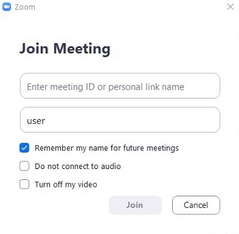 - All you have to do now is type the meeting’s ID or personal link name in the upper text box and add the preferred user name (not username as in login) in the lower one.