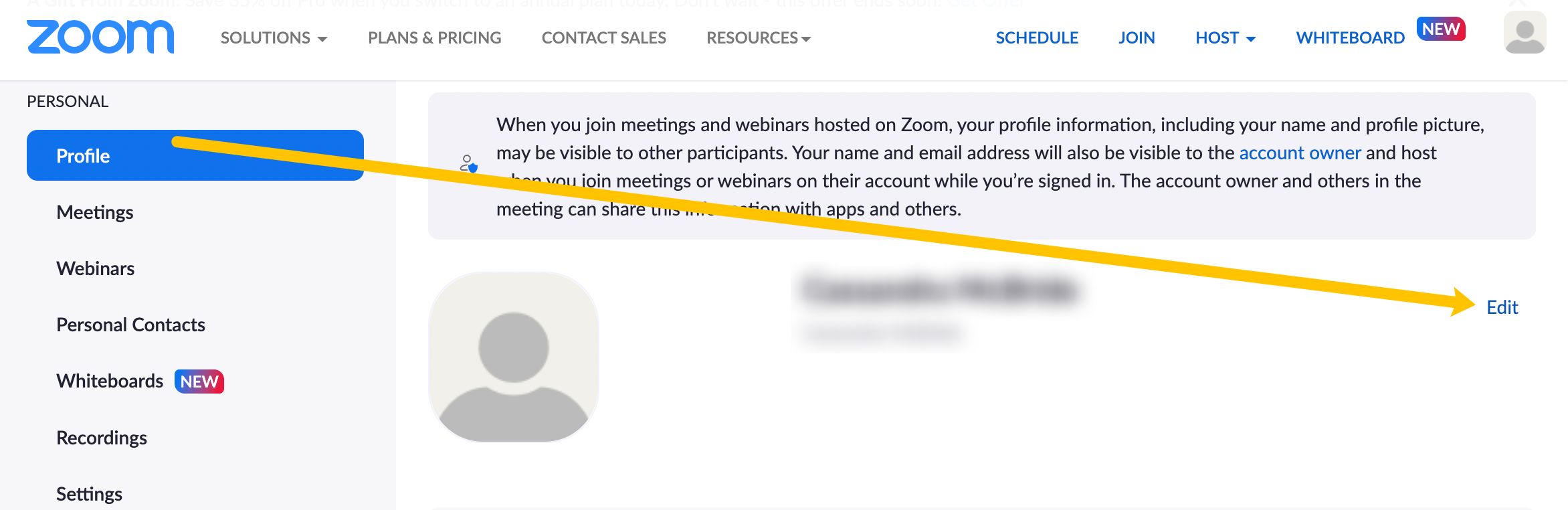 - A new window will open in your default web browser. Exit out of the Zoom Settings page. Then, click on Edit next to your name.