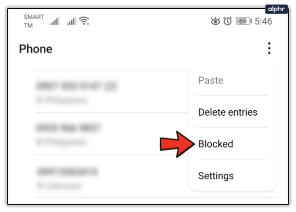- When you tap the three lines or dots, you’ll see another menu appear. This is the Settings menu for your phone. Scroll down until you get to the Blocked Numbers option and select it.