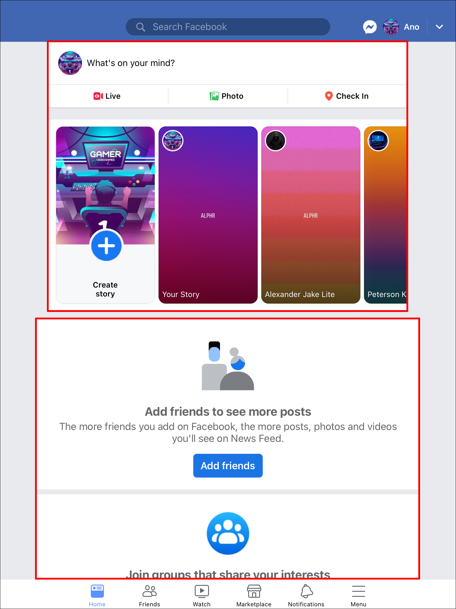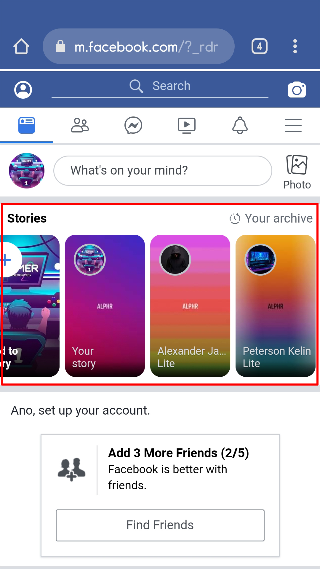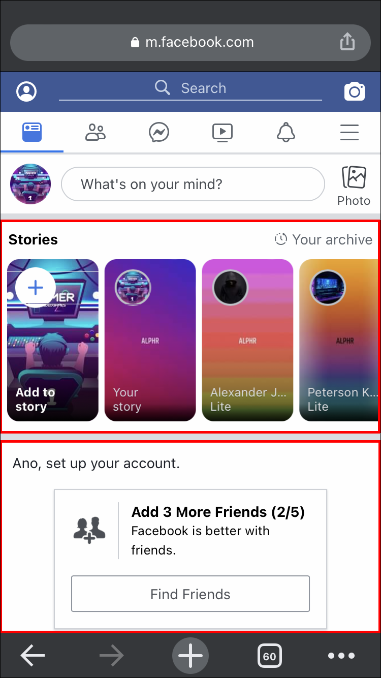 - At the top of the page, you’ll be able to see the Facebook stories that have been posted by your friends.