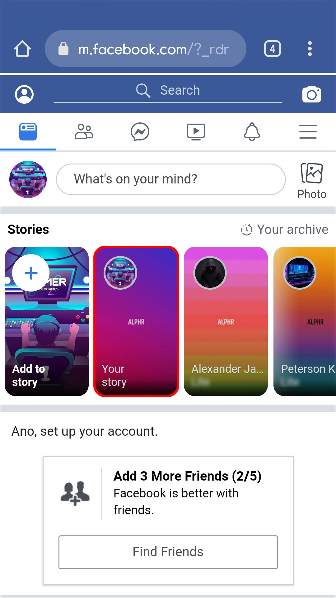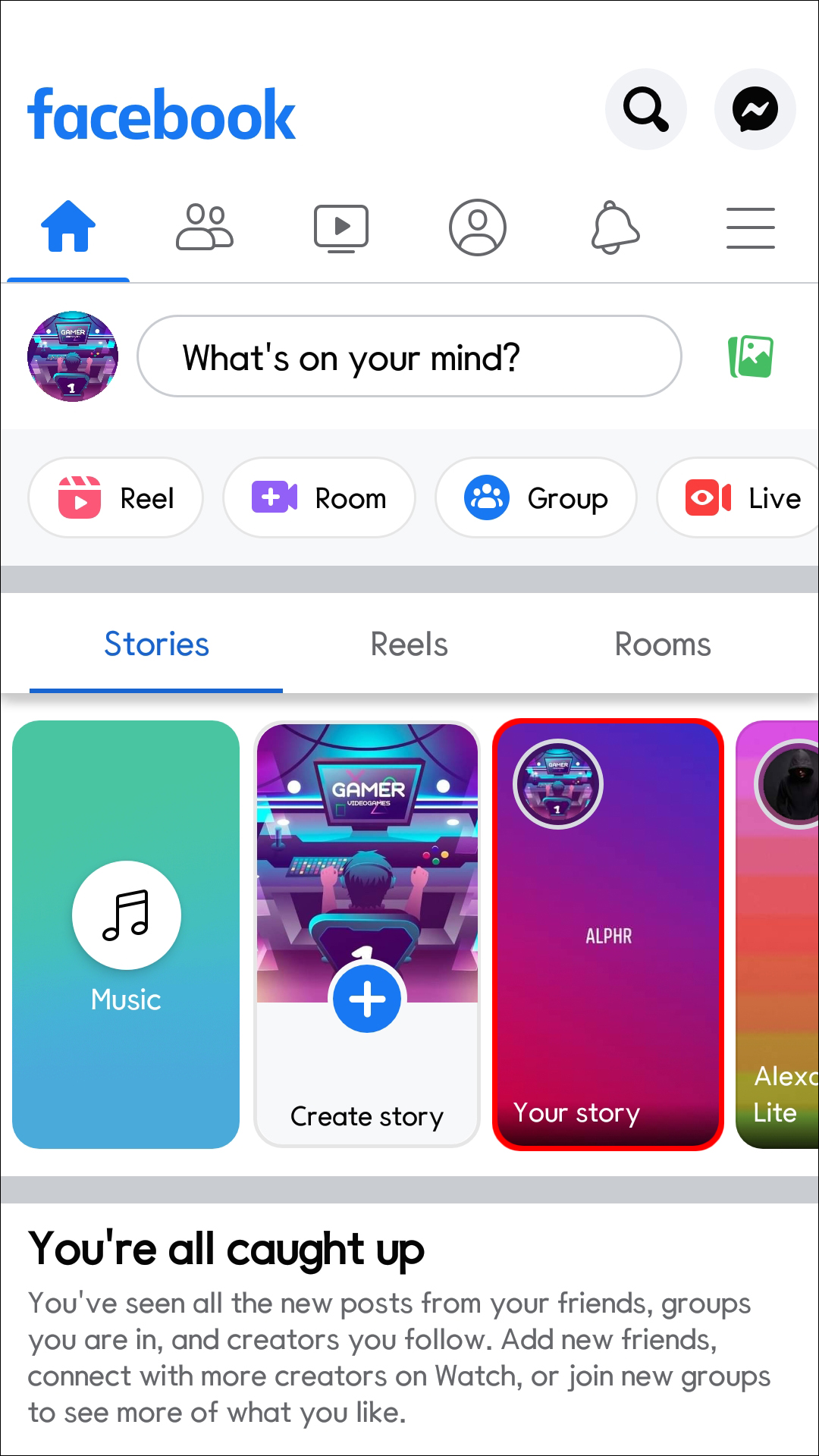 - At the top of the page, you’ll notice the Facebook stories that have been posted by your friends. This includes yours.