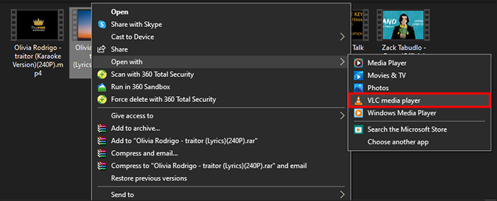 - Select a video to play in VLC. Right-click it and hit “Open with.” Select “VLC media player.”