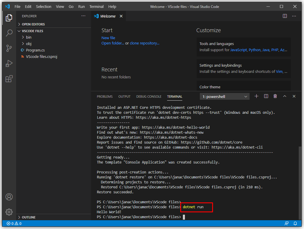 - VS Code will open a simple program that uses the namespace of your choosing. You can then go on to add more functionality to your program.
