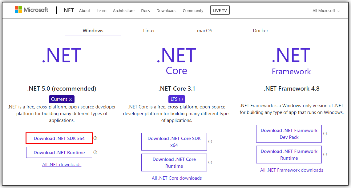 - Download and install a .NET SDK 5.0 or newer. Use the appropriate system when selecting the download file.