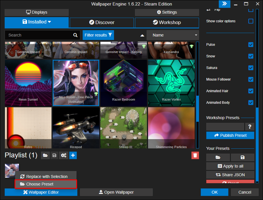 - Under “Playlist,” right-click on the wallpaper and tap “Choose preset.”