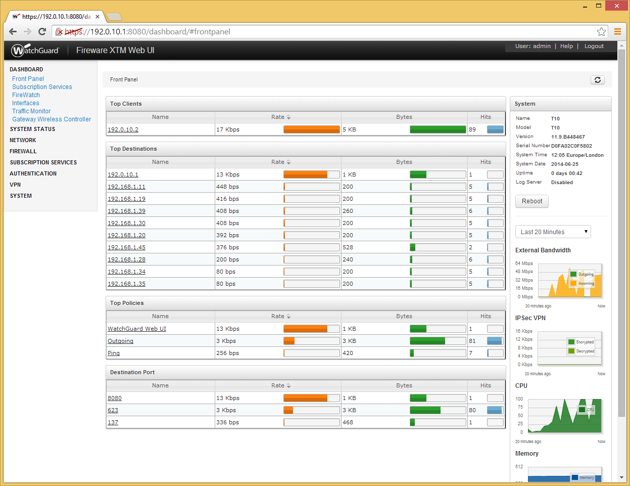 The T10 runs the same Fireware XTM firmware as its bigger brothers, which introduces a range of new features. The dashboard is much more informative and provides details of the top clients, destinations, policies and ports. Performance graphs are provided for subscription services, so you can see what’s being allowed and blocked. You can also run manual signature updates from here.