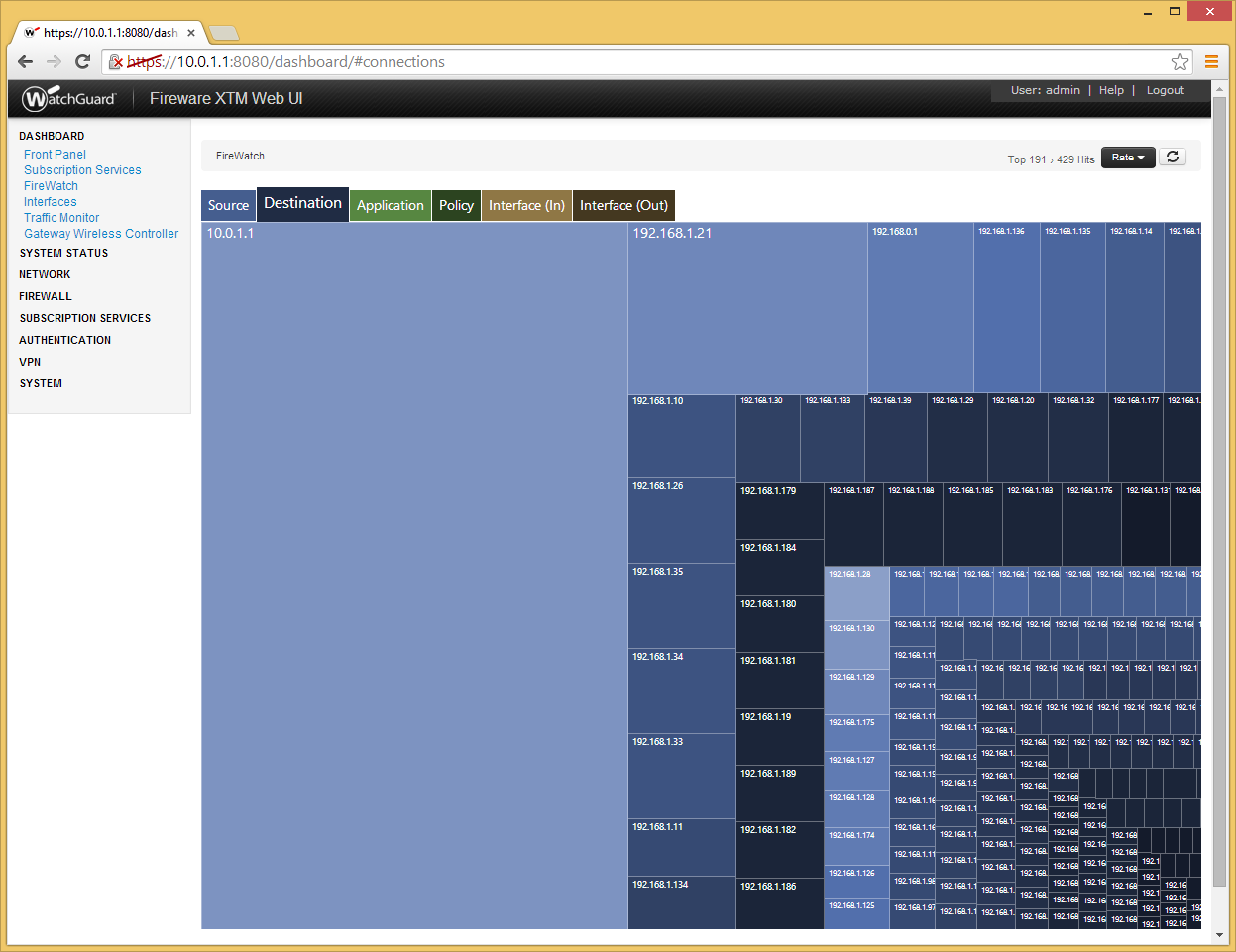 The FireWatch feature from WatchGuard’s Dimension management software also makes an appearance, displaying sets of coloured squares where their size indicates the level of activity for sources, destinations, policies, applications and interfaces. Managed service providers will appreciate the full Dimension product, which is included free of charge and runs as a VMware virtual appliance.