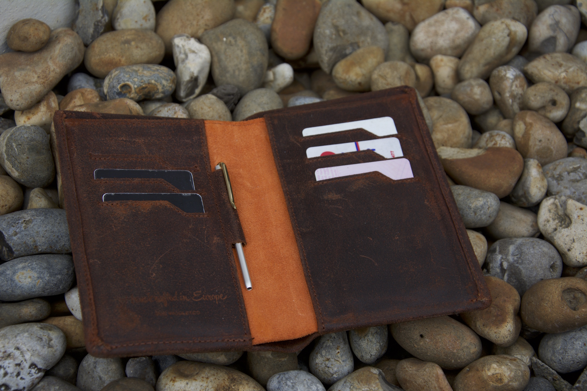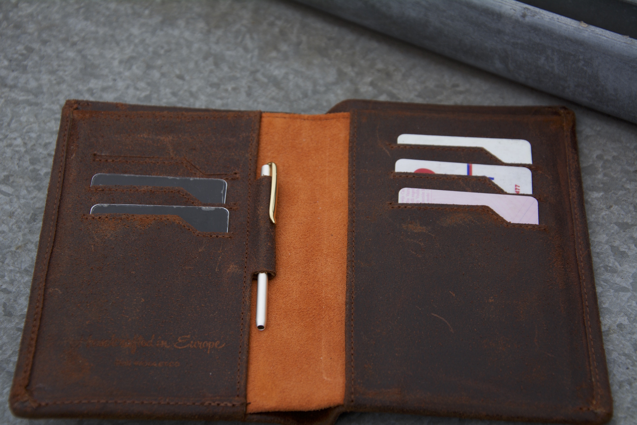 The Woolet Travel XL 2.0, on the other hand, is a beast. It’s pocket-book-sized, with space for six cards and a passport, and even has a mini pen included, slotted in a discrete loop attached the spine. The pen is stumpy enough that you wouldn’t want to write a novel with it, but it’s handy to have if you need to sign something. Despite its capacity, though, the Travel XL has a slim design that means that, surprisingly, it fits in jean pockets without much resistance.