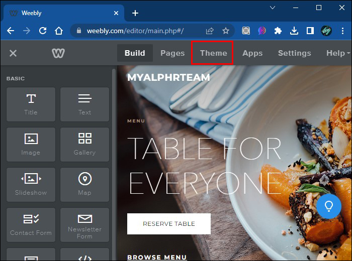- Find the site you want to change the text for and open it up in Weebly’s editor and select “Theme” from the top menu.