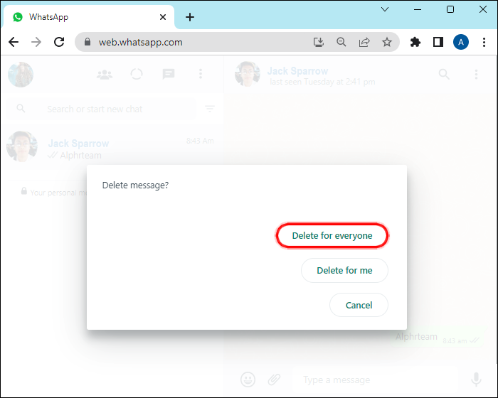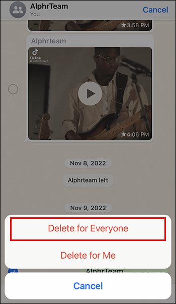 - Click “Delete for Everyone” option. “You deleted this message” will replace the original message.