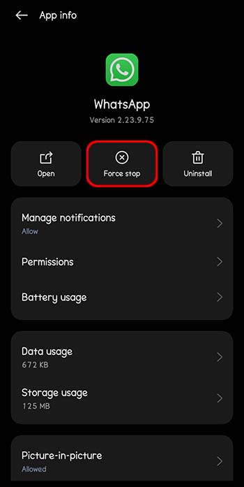 - Choose WhatsApp and “Force Stop” or “Force Close” and tap ”OK.” This freezes the app and it won’t run.