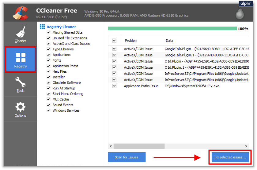 - Select the Registry tab then Scan for Issues and then Fix selected issues once the scan completes.