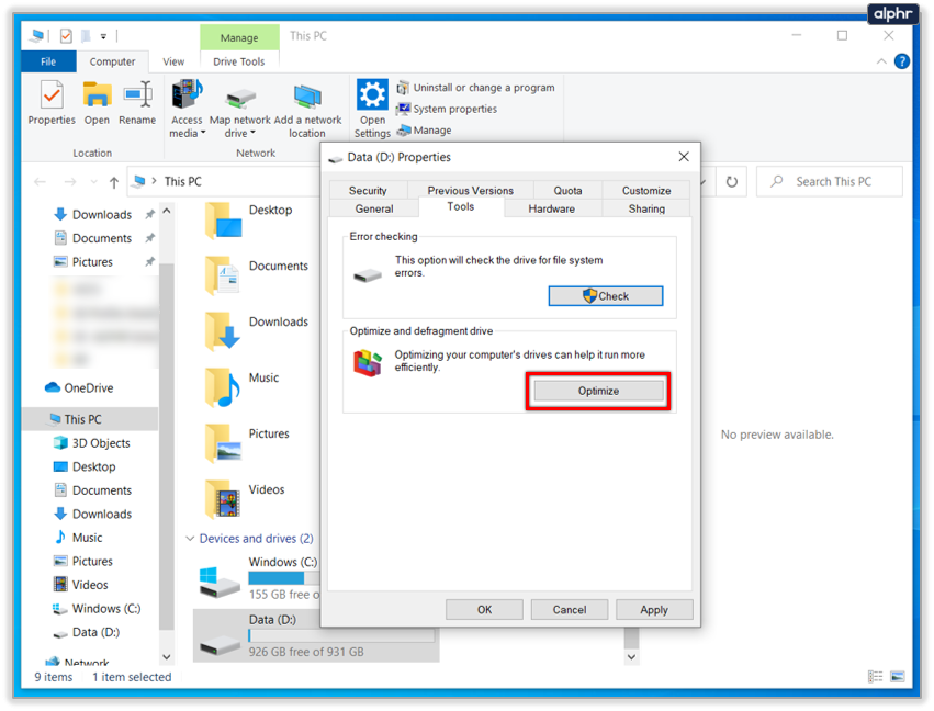 - Select Optimize, select a disk and then Analyze. If any hard disk is fragmented over 10%, click Optimize.